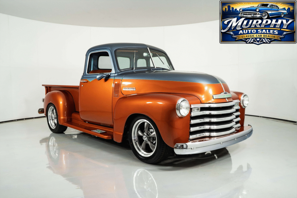 This 1950 Chevrolet 3100 truck is a stunningly restored classic with a bold orange finish that grabs attention wherever it goes. With just 381 miles on the clock, it’s powered by a 350 C.I. V8 engine paired with a 3-speed automatic transmission, offering both power and smoothness. The truck rolls on 18" American Racing wheels, fitted with 235/55/R18 tires, blending vintage style with modern performance. Inside, the orange interior features leather and vinyl bench seating for a…